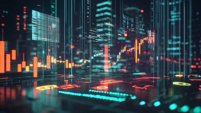 digital financial chart with blue bars and graphs representing data trends and analysis. background features abstract technology elements, conveying sense of modern finance
