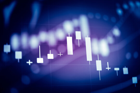 Concept of stock market and fintech forex concept. Blurry blue digital charts over dark blue background. Futuristic financial interface.