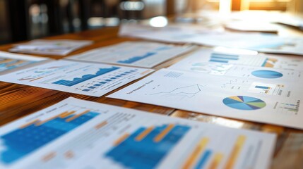 A set of printed business reports and charts, spread out on a wooden conference table