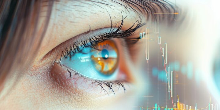 Close up of businesswoman eye with financial graph reflecting in eye. Attractive woman looking financial and marketing data with stock market chart or increasing sales graph reflect in the eye. AIG42.