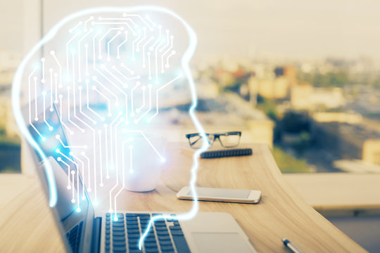 Multi exposure of work space with computer and human brain hologram. Brainstorm concept.
