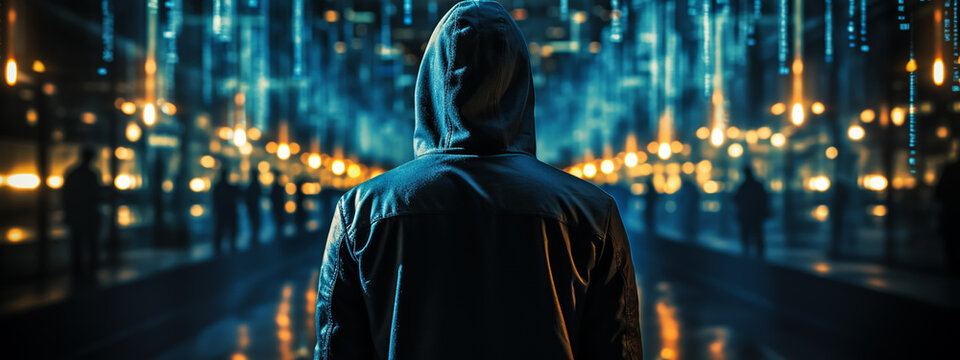 cybersecurity and hacker,coding,malware concept.Hooded computer hacker in cybersecurity on server room background.metaverse digital world technology.