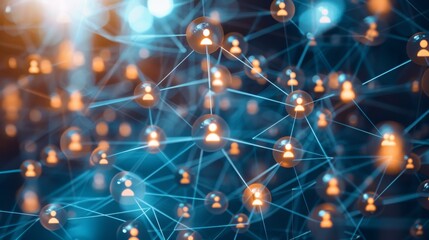 Business network with global reach, highlighting data analysis, customer connections, and HR recruitment. Emphasis on technology, social networks, and teamwork