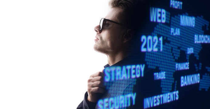 Double exposure portrait of guy on white background. Man in classic suit. Cryptocurrency, finance, business, innovative ideas concept. Futuristic holographic interface to display data.