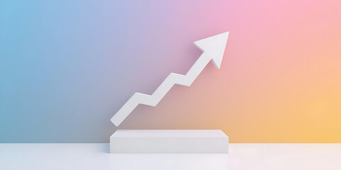 A modern, abstract style 3D white upward arrow on a gradient background wall symbolizes progress, transitioning from blue to pink to yellow.