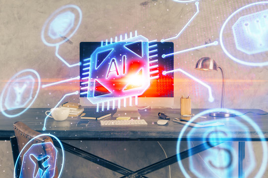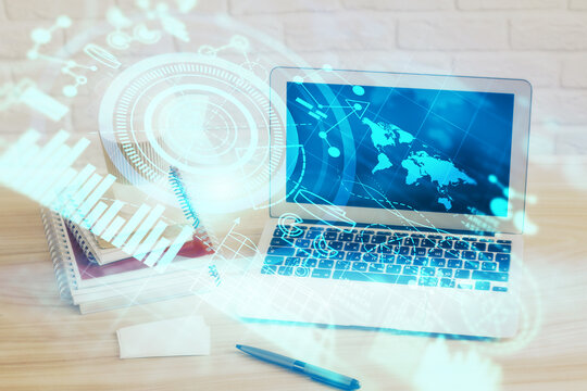 Business theme concept hologram with desktop office background. Double exposure.