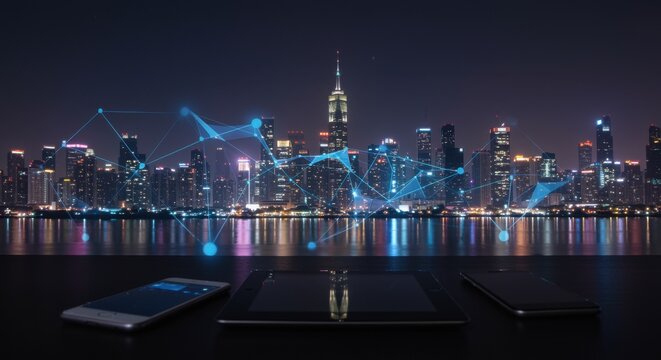 Connected city skyline at night with digital network overlay and devices in foreground