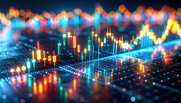 Abstract digital financial chart with glowing blue bars and lines.