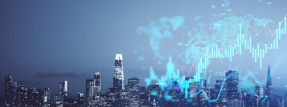 Modern city skyline with digital financial graph overlay and glowing holographic data elements in abstract double exposure style at night.
