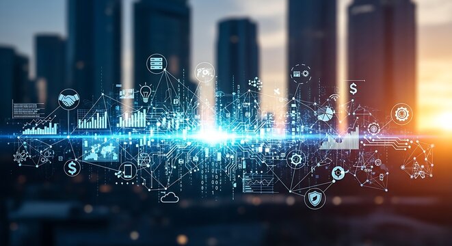 A world map overlaid on a cityscape, representing global connectivity and communication.