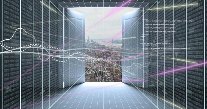 Financial data processing over futuristic cityscape