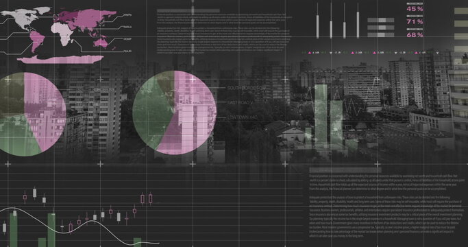 This image captures a sleek digital interface showcasing various data visualizations over a panoramic cityscape. Ideal for technology, business, or analytics themes. Impute