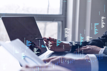 Two traders researching historic data to predict stock market behavior using laptop. Internet trading concept. Forex and financial hologram chart. Forecasting and planning.