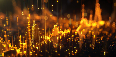 Digital stock market graph with golden light on black background