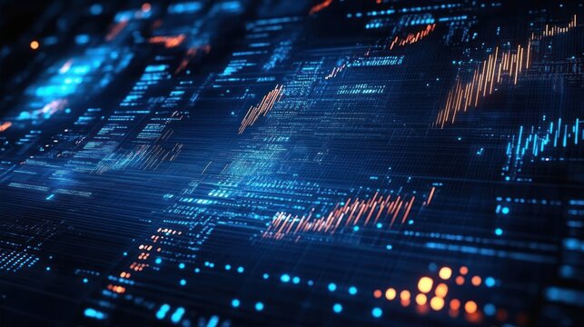 Digital financial data visualization over dark background