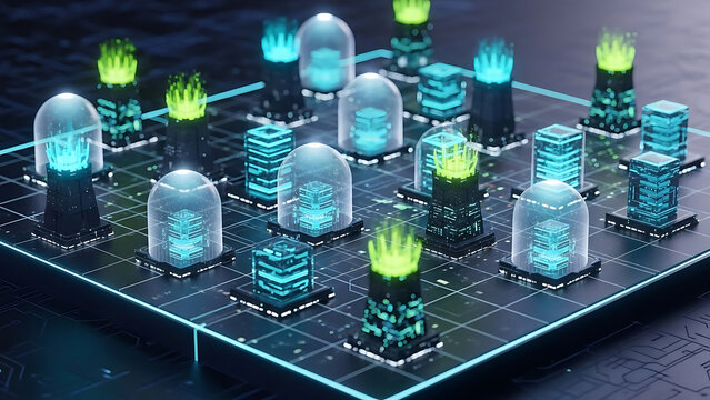Fintech 3d data visualization showcasing glowing abstract financial structures on a circuit board grid with neon blue accents