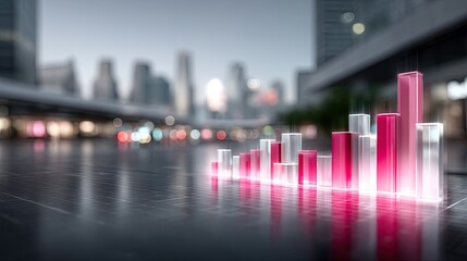 Financial Graph Chart with Pink Bars on Reflective Surface and Cityscape Background