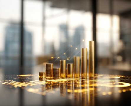 Golden chart rising on a reflective surface, blurred modern background