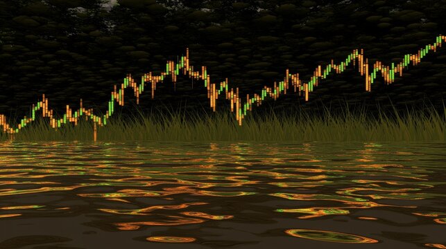 Abstract representation of financial trading data displayed through vibrant candlestick chart against a reflective water surface amidst a natural setting at twilight.