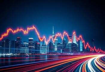 Abstract light trails forming financial graph over city skyline, depicting stock market trends, business growth, financial graph