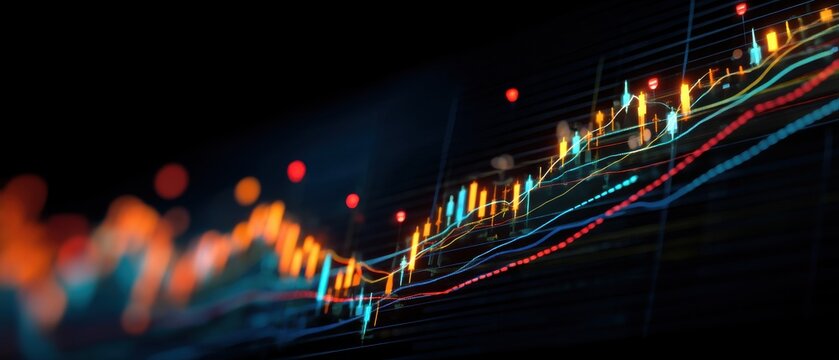 Abstract illustration of financial data with multicolored line graphs and bokeh effect