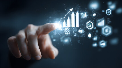 Financial concepts are visualized as a hand interacts with glowing data charts and icons, illustrating growth and progress within a digital, futuristic environment.