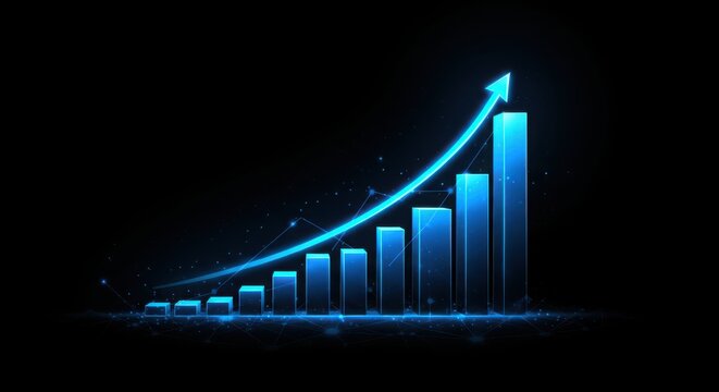 A glowing blue bar chart showing upward growth and progress on a dark background