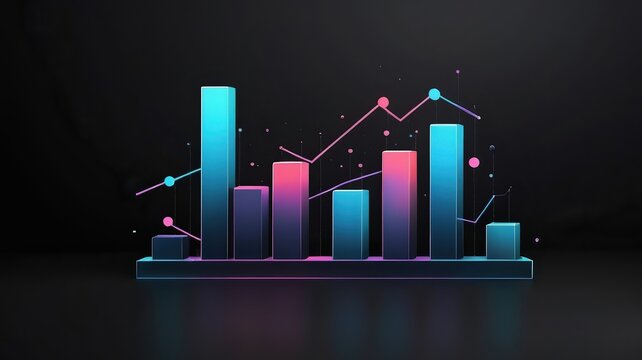 Abstract 3d rendering of glowing line graph and bar chart showing financial market data analysis and business growth trend on dark background