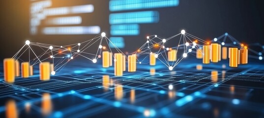 Wireframe illustration of financial graph with digital data points and glowing nodes
