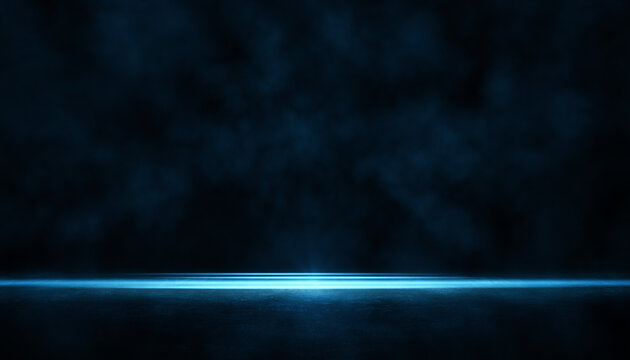 The dark stage shows, dark blue background, an empty dark scene, neon light, spotlights The asphalt floor and studio room with smoke float up the interior texture for display products