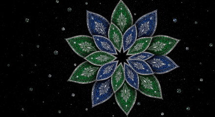 A flower design with green and blue petals adorned with white floral pattern, on a black background with diamond shape objects, representing elegance