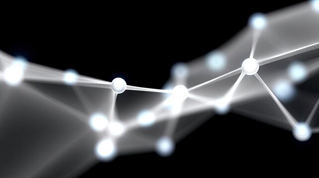 An abstract digital visualization of a network structure with interconnected glowing nodes and lines, set against a dark, blurred background. The light is soft