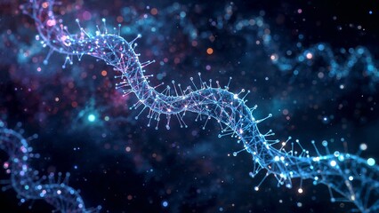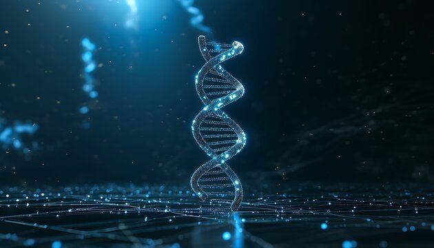 A glowing, 3D model of a DNA double helix, set against a dark, futuristic backdrop.