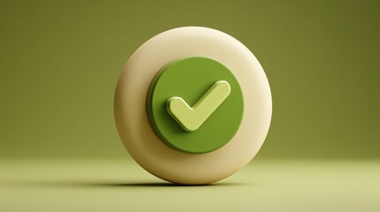 Green approval button with checkmark, set within a textured beige circular holder against a soft green background.