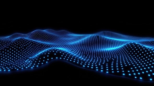Abstract digital landscape of glowing blue dots.  A mesmerizing display of interconnected points forming undulating waves against a dark backdrop, creating an ethereal and futuristic aesthetic