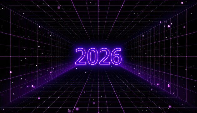 Futuristic 2026 Neon Sign in Cyberpunk Grid, Purple Glow, Digital Art.