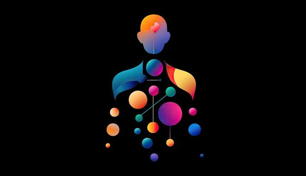 Abstract human figure, vibrant colors, gradient shapes, connected elements