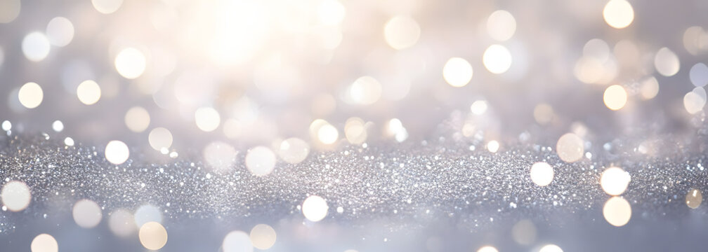 abstract backgrounf of glitter vintage lights . silver and white. de-focused. banner