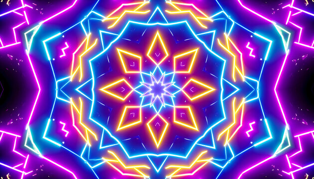 Abstract Geometric Neon Design with Vibrant Colors and Symmetrical Starburst Pattern on Black Background