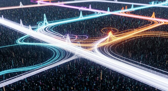 Aerial view of illuminated light trails on a dark background with abstract geometric shapes overlaying it