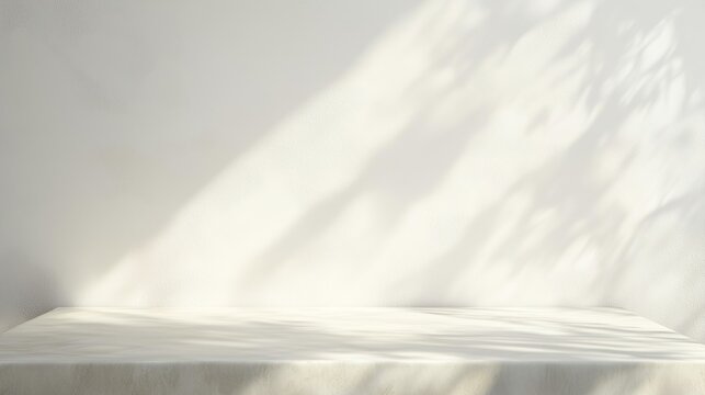Simple white light beige background for product presentation. Light walls and floor with soft shadow and light from the window.