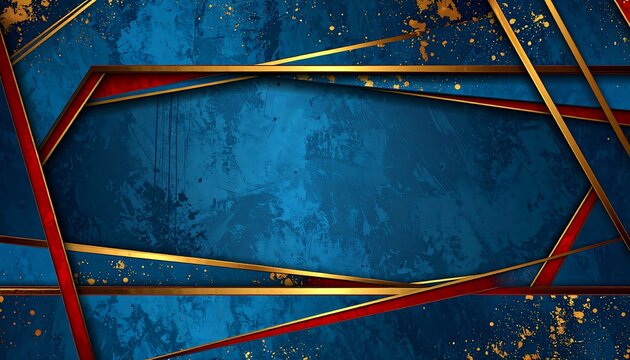 Abstract image with layered gold and red lines over a textured blue background with gold specks