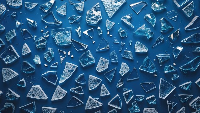 Fractured glass shards scattered over a vibrant blue background creating a textured and visually striking abstract composition