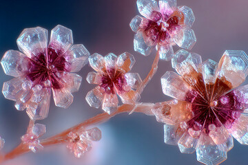 Delicate crystal structures resembling blooming flowers under a microscope with vibrant pink, purple, and blue hues against a soft gradient background