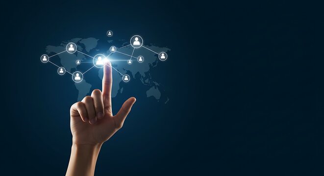 Human hand touching global network map, digital connection, modern communication technology.