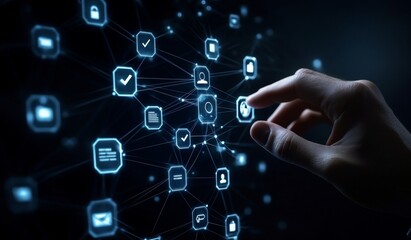 Interwoven blue and orange nodes flow across a dynamic network field, depicting real time data exchange and the connective fabric of digital communication.