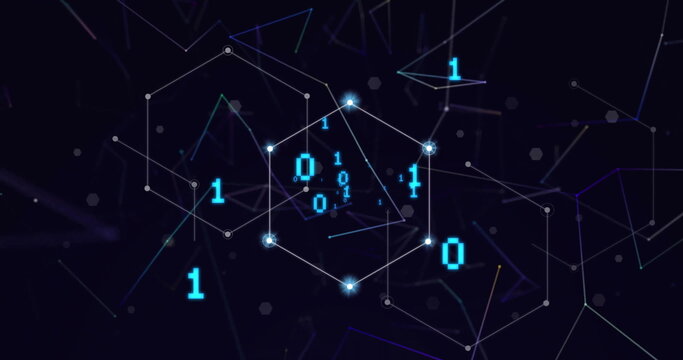 Image of digital data processing binary coding over floating mesh on black background