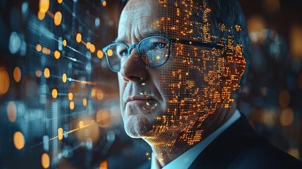 Man with glasses, orange digital overlay with lines & dots, tech, focused