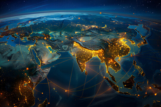 Digital illustration depicting global financial technology with futuristic elements on a white background with blue and purple isometric design