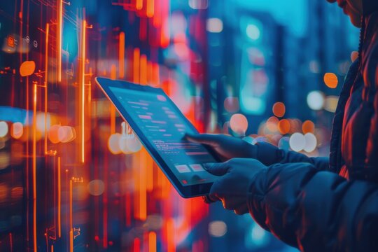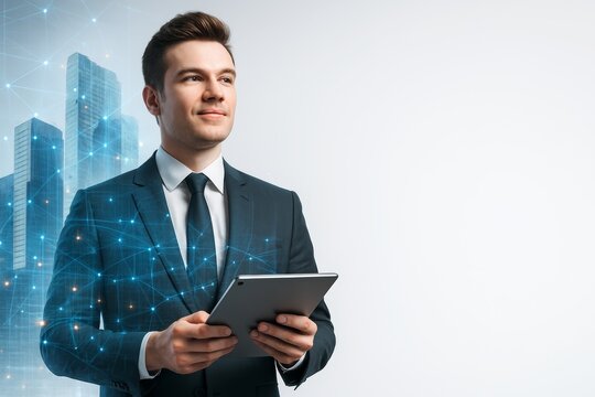 Man in suit using tablet with glowing digital interface and data visualization